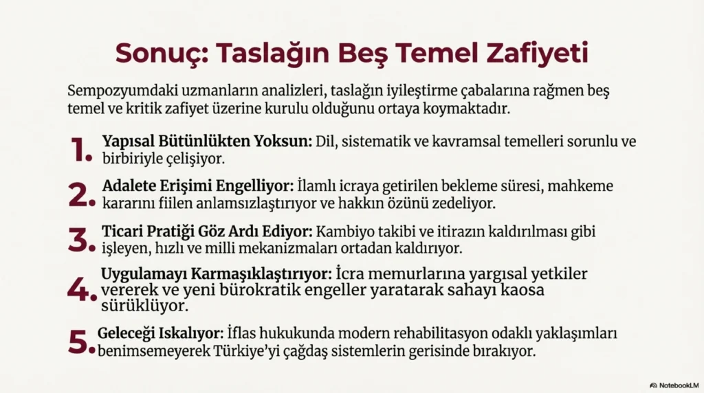 Uzmanların eleştirileri, 10 yıllık bir emeğin ürünü olan Cebri İcra Kanunu Taslağı’nın ciddi yapısal, mantıksal ve hatta metinsel kusurlar barındırdığını gösteriyor. Ortaya konan bulgular, taslağın bu haliyle icra sistemindeki mevcut gecikme ve verimsizlik sorunlarını çözmek bir yana, daha da kötüleştirme potansiyeli taşıdığını düşündürüyor.