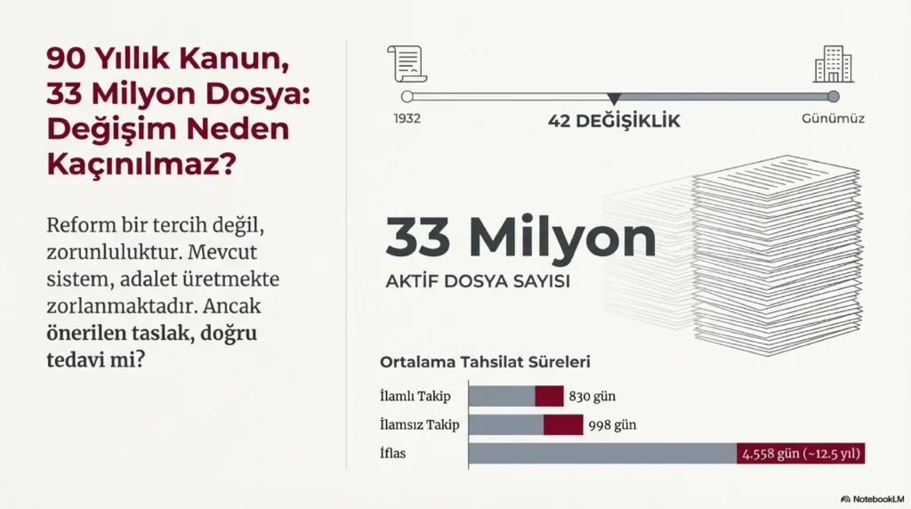 Türkiye’de icra dairelerindeki dosya sayısı, Prof. Dr. Ejder Yılmaz’ın belirttiği üzere yaklaşık 33 milyona ulaşmış durumda. İlamlı bir takibin sonuçlanması ortalama 830 gün sürerken, bu rakamlar milyonlarca vatandaşın hayatına doğrudan dokunan devasa bir sorunun karşılığı. Mevcut İcra ve İflas Kanunumuzun 1932 yılından kalma, 90 yıllık bir metin olduğu ve bugüne dek 40’tan fazla kez değişikliğe uğradığı düşünüldüğünde, köklü bir yeniliğe duyulan ihtiyaç aşikâr.