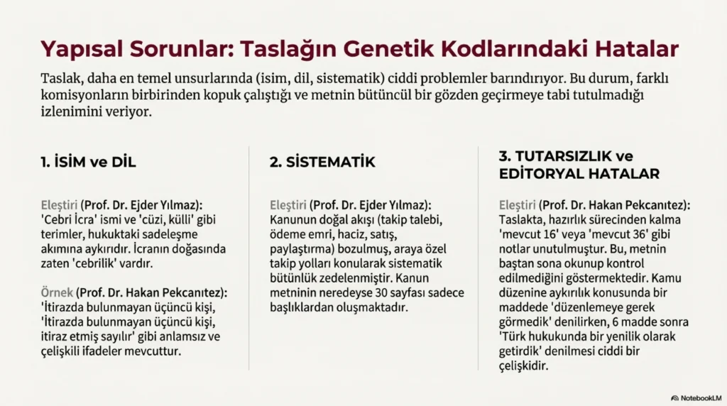 Uzmanların ortaya koyduğu belki de en şaşırtıcı bulgu, taslak metninde yer alan temel editöryel hatalardı. Prof. Dr. Hakan Pekcanıtez, metnin içinde kanunlaşmaması gereken ve hazırlık sürecinden kaldığı anlaşılan (mevcut 16) gibi notların unutulduğunu tespit etti. Bu, metnin son halinin titiz bir kontrolden geçirilmediğine dair ciddi bir işaretti.