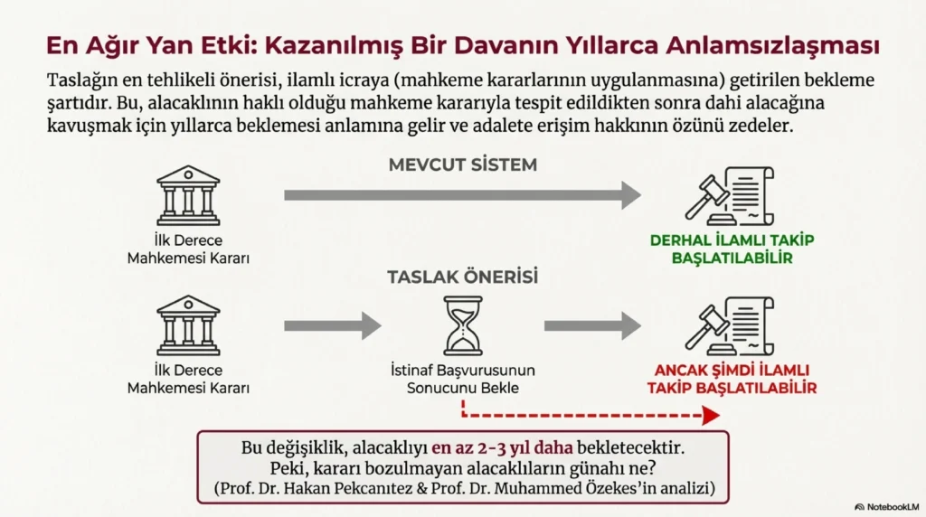 Taslağın getirdiği en tartışmalı yeniliklerden biri, bir davayı ilk derece mahkemesinde kazanan alacaklının, karar istinaf (temyiz öncesi üst mahkeme) sürecinden geçmeden icra takibi başlatmasını engellemesi. Zaten ortalama 830 gün süren bir sistemde, bu kuralın yaratacağı ek gecikmeyi Prof. Dr. Hakan Pekcanıtez somut bir örnekle açıklıyor: “2 yıl ilk derece mahkemesinde geçti 2 yılda istinafta geçecek“. Bu, mahkeme tarafından haklılığı zaten tespit edilmiş bir kişinin alacağına kavuşmak için yıllarca daha beklemesi anlamına geliyor.