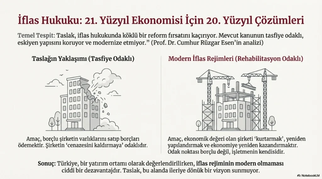 Prof. Dr. Hakan Pekcanıtez, modern iflas hukukunun amacının sadece borçlu şirketleri tasfiye etmek değil, “mümkünse yeniden yapılandırma çabası içinde” olarak ekonomiye yeniden kazandırmak olduğunu vurguluyor. Ancak taslak, bu modern yaklaşımı benimsemek yerine, iflası bir ceza olarak gören eski ve cezalandırıcı bir anlayışı pekiştiriyor.