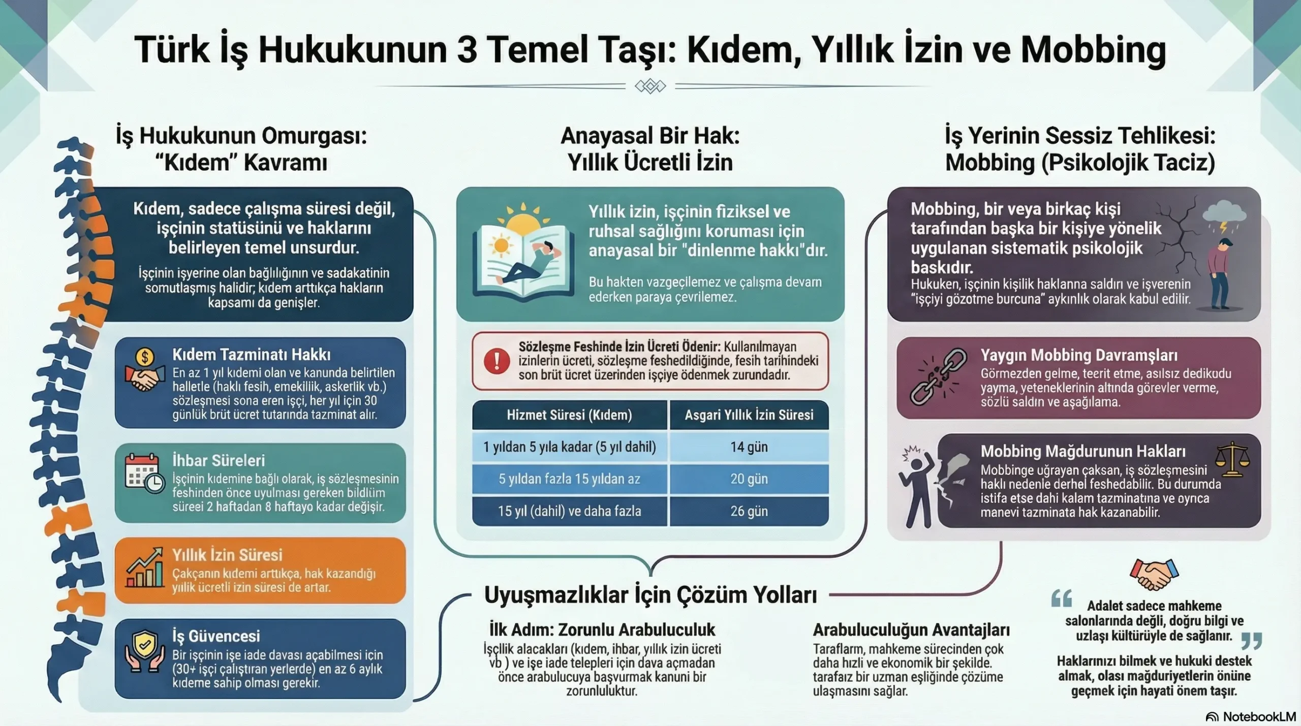 İş hayatı, işverenler ve çalışanlar arasında kurulan hukuki bir denge üzerine kuruludur. 4857 sayılı İş Kanunu, bu ilişkinin temel anayasası olsa da; kıdem kavramı, yıllık izin hakları ve son yıllarda giderek daha fazla gündeme gelen “mobbing” (psikolojik taciz), çalışma barışını en çok etkileyen unsurlar olarak karşımıza çıkmaktadır.