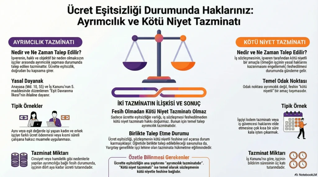 • Eğer ücret eşitsizliği gibi bir ayrımcılık, iş sözleşmesinin kötü niyetli bir şekilde feshedilmesine neden olursa, bu iki tazminatın ilişkisi karmaşıklaşabilir ve duruma göre ayrımcılık tazminatı veya her ikisinin de talep edilmesi söz konusu olabilir. Ancak, yalnızca ücrette eşitsizliğin varlığı, iş sözleşmesinin feshi olmaksızın kötü niyet tazminatı hakkı doğurmaz.